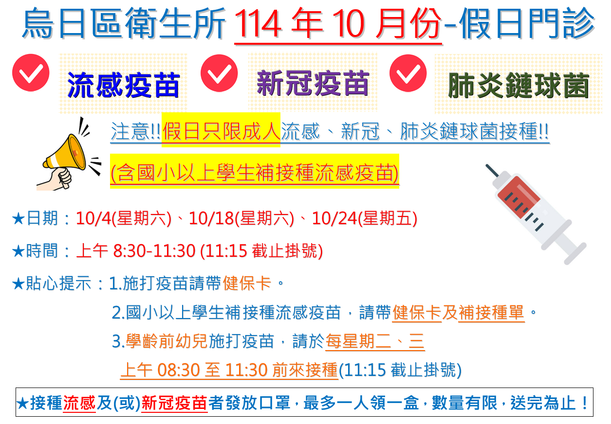 為方便民眾接種疫苗,本所於10月份加開假日流感、新冠疫苗及肺炎鏈球菌接種門診(假日只提供成人接種及國小以上學童補接種流感疫苗):