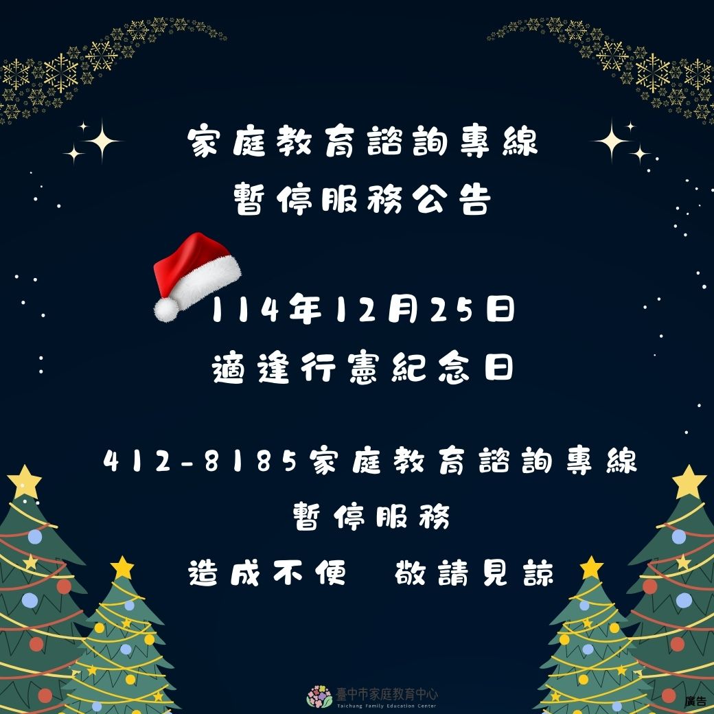 114年12月25日(星期四),共1日,適逢行憲紀念日,412-8185家庭教育諮詢專線暫停服務。