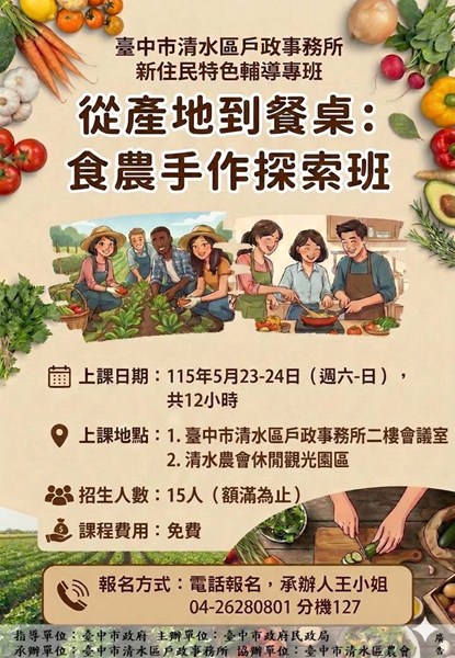 1.招生對象:新住民共15名(額滿為止)。2.上課地點:臺中市清水區戶政事務所二樓會議室(臺中市清水區鰲峰路239號) 、清水區農會休閒觀光園區(臺中市清水區三順路2巷2號)。3.課程時間:115年5...