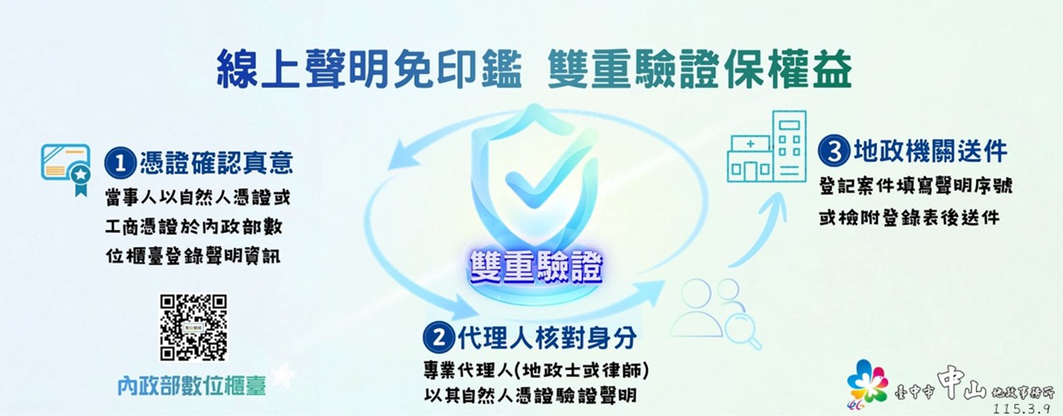 為兼顧民眾申辦土地登記之便利性與不動產交易安全,並降低實體印鑑證明交付第三人可能衍生之風險,內政部推廣「土地登記線上聲明」便民服務,提供免申請印鑑證明、免當事人親自到場之替代管道。 【線上聲明三步驟】...